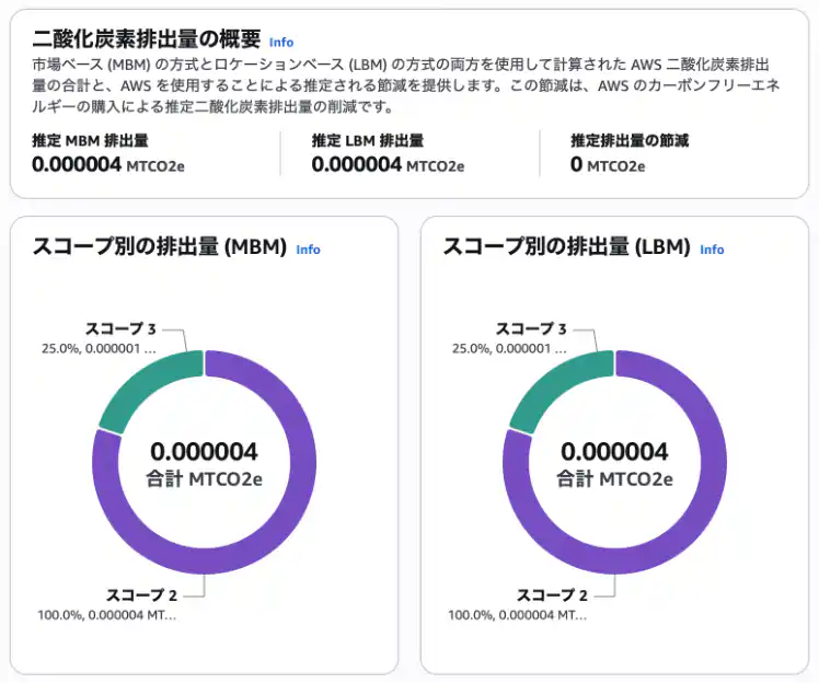 当社でもAWS Sustainability コンソールにアクセスし、実際の表示を確認しました。今回の画面では、推定MBM排出量と推定LBM排出量はいずれも0.000004 MTCO2eで、削減量は0 MTCO2eと表示されました。もっとも、利用量自体が非常に小さいため、この結果だけでMBM(市場ベース)とLBM(地域電力網ベース)の差が本当に存在しないと断定することはできません。表示粒度や利用条件の影響も含め、参考値として見るのが適切です。いずれにせよ、今回確認した結果からは、当社ウェブサイトに関連するAWS利用由来の排出量が非常に小さいことがうかがえます。